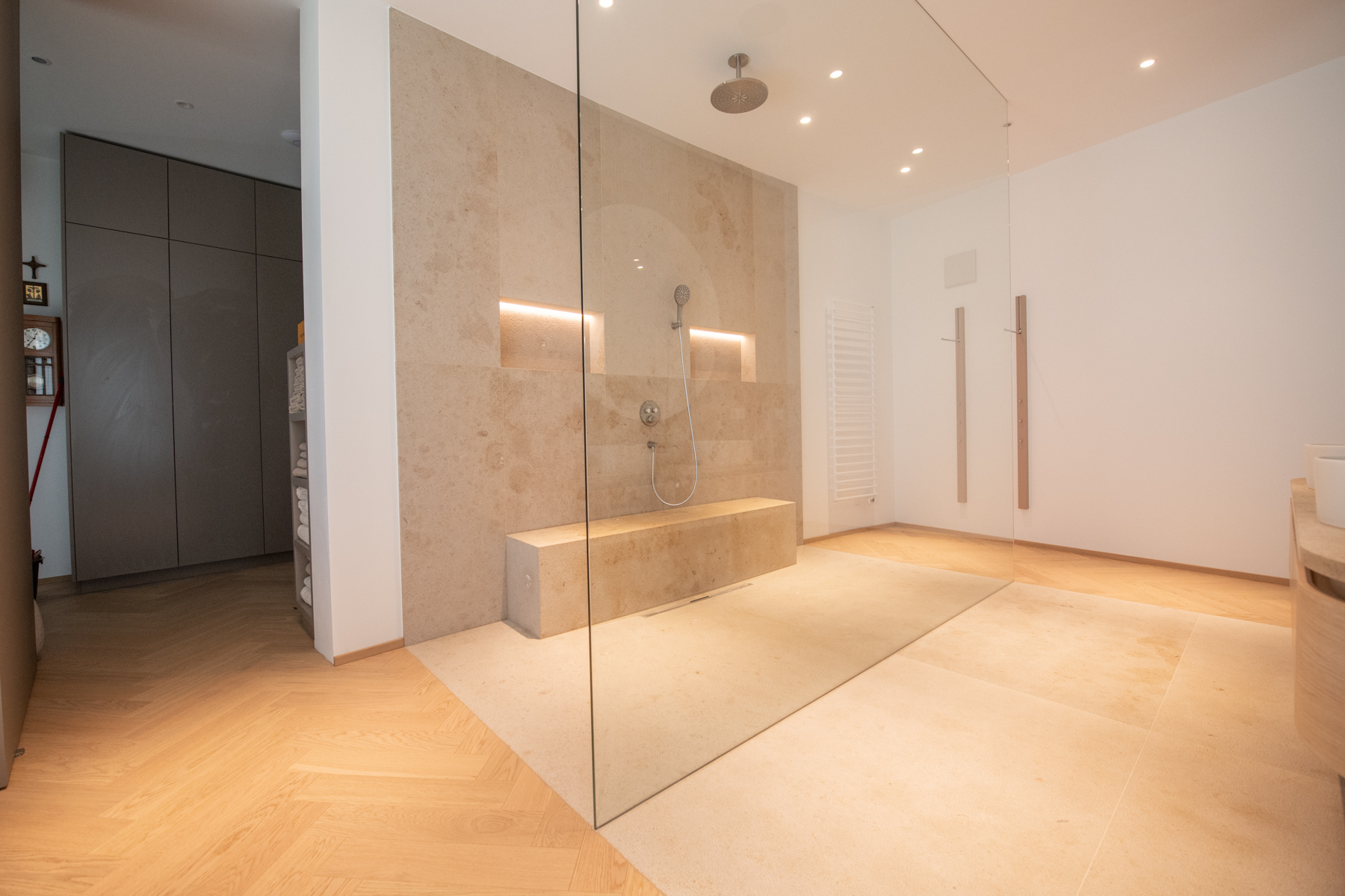 Dieses Wellness-Badezimmer zeigt, wie viel Erholung im eigenen Zuhause möglich ist. Der großzügige Raum wurde mit dem Ziel geplant, Ruhe erlebbar zu machen – ein Rückzugsort, der den Alltag für einen Moment leiser werden lässt. Mittelpunkt ist die luxuriöse Dusche mit gefliester Sitzbank, die zum Verweilen einlädt und jeden Duschgang in eine kleine Spa-Auszeit verwandelt.