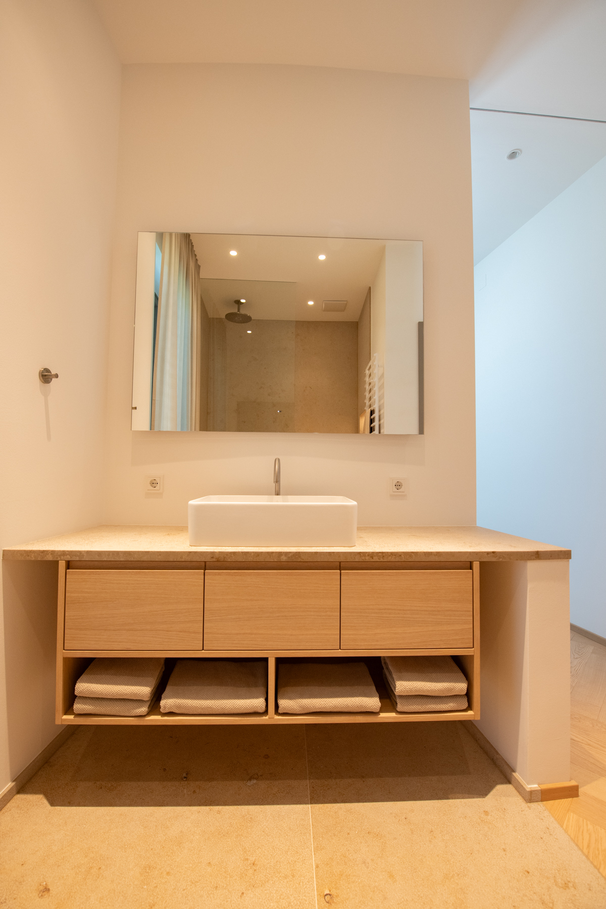 Sanfte Farben, ausgewählte Materialien und eine klare Raumstruktur schaffen ein harmonisches Gesamtbild, das Entspannung fördert. Hier fließen Funktionalität und Wohlgefühl zusammen: ein Bad, das nicht nur durch Größe beeindruckt, sondern vor allem durch Atmosphäre – ein Ort, an dem man Kraft tanken und zur Ruhe kommen kann.