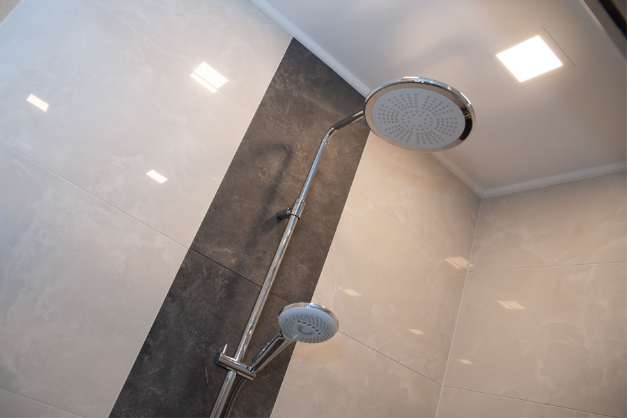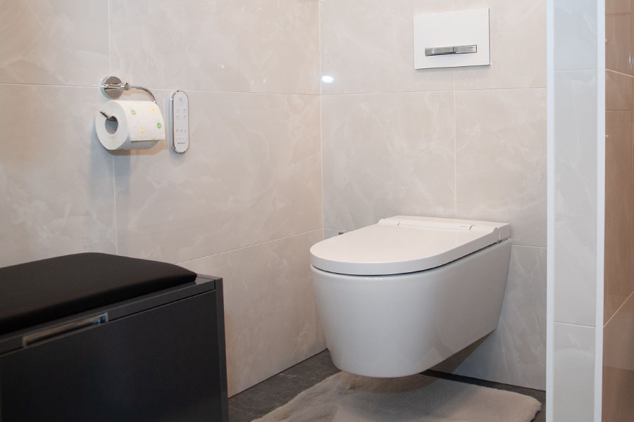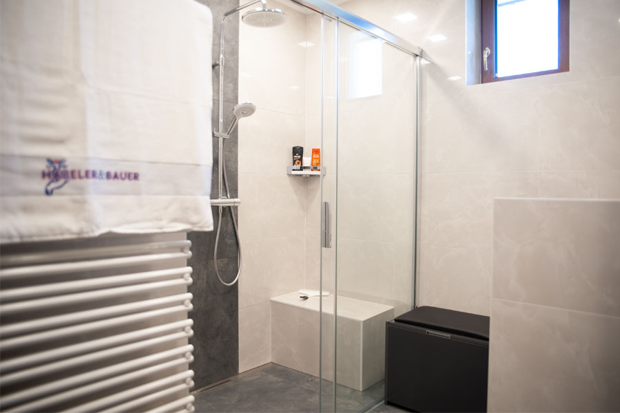 Die frei begehbare Dusche mit bodenebenem Duscheinstieg, Duschrinne und Schiebetür bietet höchsten Komfort. Ausgestattet mit einer Aufputz Thermostatarmatur, Hand und Kopfbrause sowie einer integrierten, beheizten Sitzbank erfüllt sie sowohl funktionale als auch komfortorientierte Ansprüche.