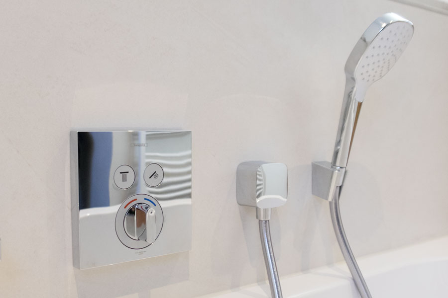 Die frei begehbare Dusche mit Duschrinne, Flügeltür, Unterputz Mischbatterie sowie Hand und Kopfbrause bietet hohen Komfort und eine klare, zeitlose Optik. Ergänzt wird das Badezimmer durch eine freistehende Badewanne mit Unterputz Mischbatterie und Handbrause, die zum Entspannen einlädt.