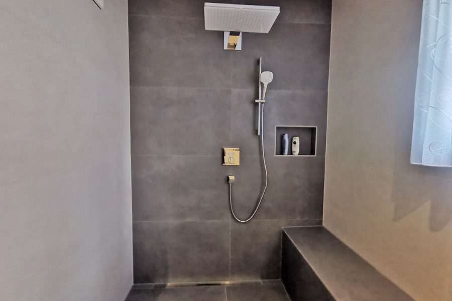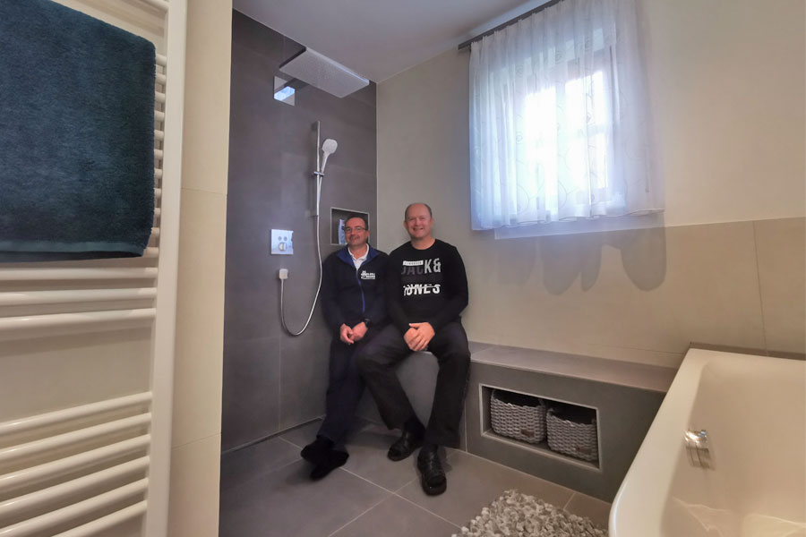 „Mit unseren früheren Installateuren waren wir nicht glücklich und sind dann über eine Empfehlung zur Firma Hauskrauft Installationen gekommen. Jetzt sind wir restlos zufrieden. Der Badumbau wurde super geplant und umgesetzt. Durch die Neuinstallation der Zirkulationleitung und –pumpe haben wir jetzt sofort warmes Wasser. Sehr angenehm ist auch, dass die Fußbodenheizung zum Teil unter der Dusche verläuft.”